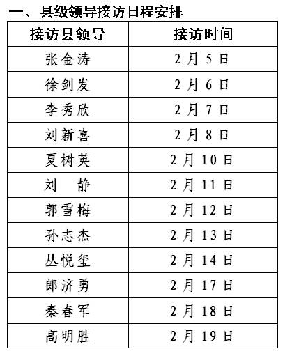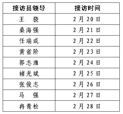 为畅通信访渠道,维护人民群众合法权益,促进社会和谐稳定,现将2025年2月份县级领导公开接待群众来访的有关事宜公告如下: